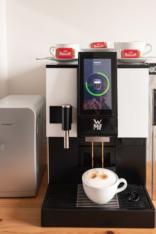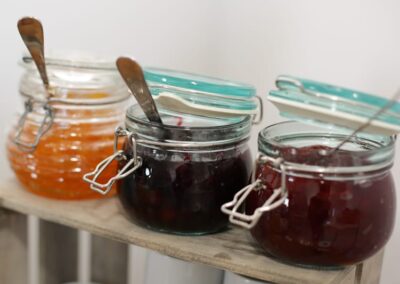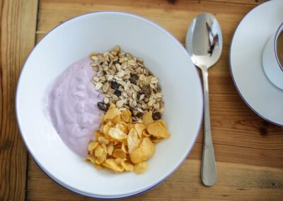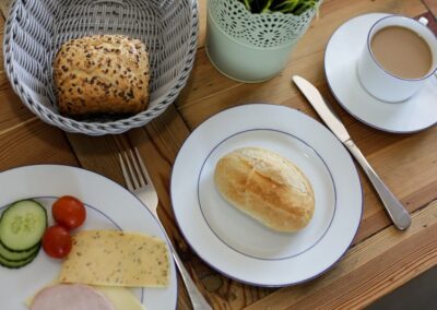 Optional haben Sie bei uns die Möglichkeit sich mit einem reichhaltigen Frühstücksbuffet für den Tag zu stärken. Dafür gibt es in unserer Unterkunft einen hellen Frühstücksraum – Hunde müssen hier leider draußen bleiben. Dort riecht es schon Morgens nach frisch gebrühtem Kaffee. Aber auch Tee- und Kakao-Liebhaber kommen bei uns nicht zu kurz. Wer es etwas fruchtiger mag, bedient sich am frischen Obst oder unserem Saft.
